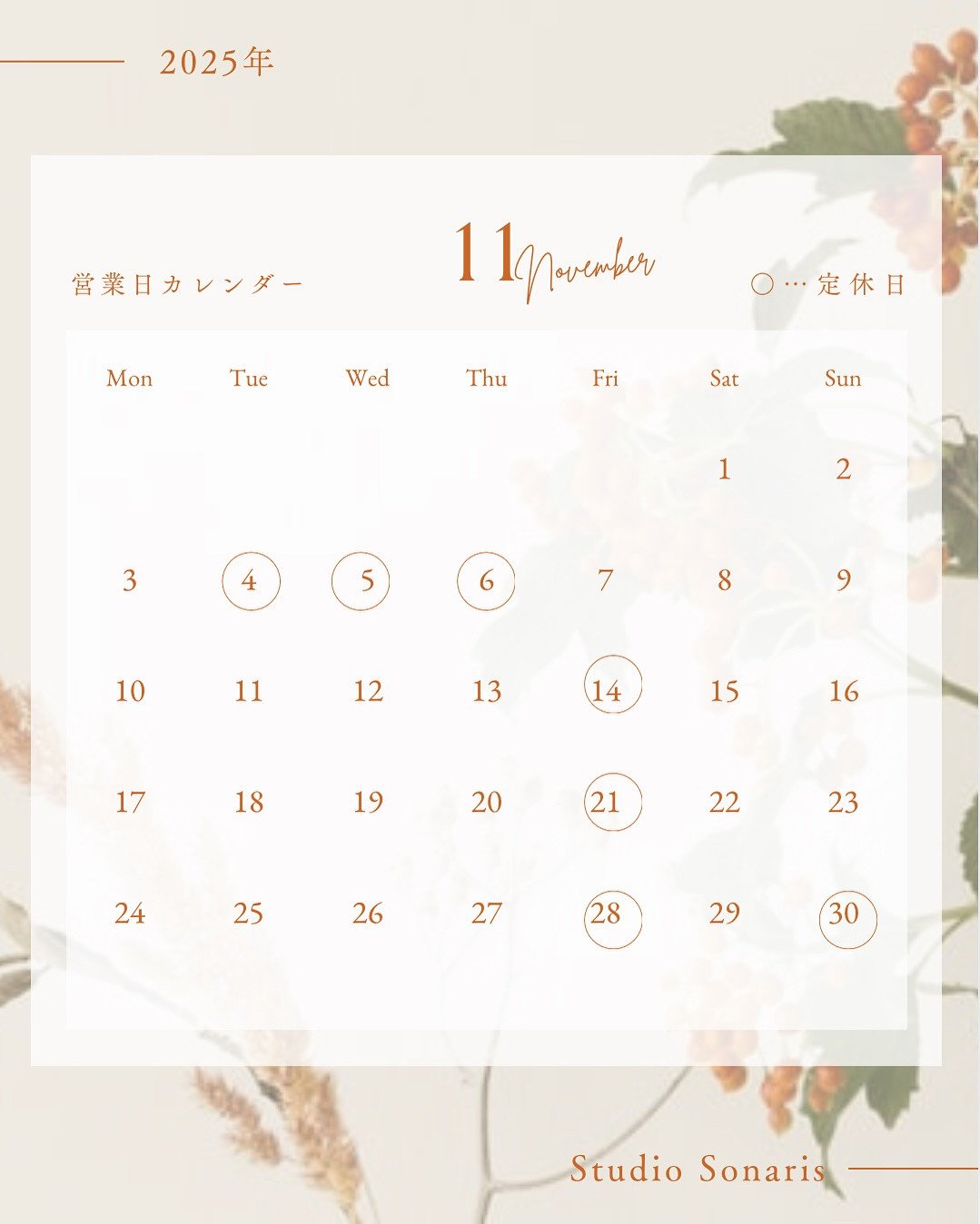 11月営業日のおしらせ🍂(カレンダーは、お休みの日に◯がついています。)11月の定休日は少し変則的になっております。上旬はオーナ...