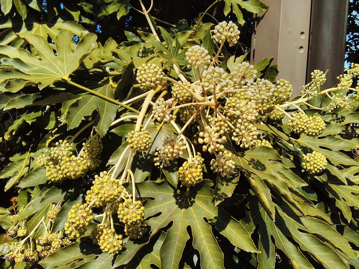 ヤツデの実とそれを食べに来たヒヨドリ…でしょうか。奥にある熟したものを狙っていそうです。少し前に開花しました。サクラのように...