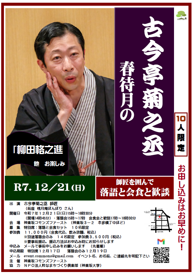 神楽坂コモンズ1st主催、古今亭菊之丞師匠をお招きし、師匠を囲んで落語と歓談と会食を楽しんで頂ける、人数限定の特別席のご案内です。12月(春待月)の会も、贅沢に、たっぷりの江戸前落語と、師匠を交えての楽しい宴席をお楽しみ下さい。