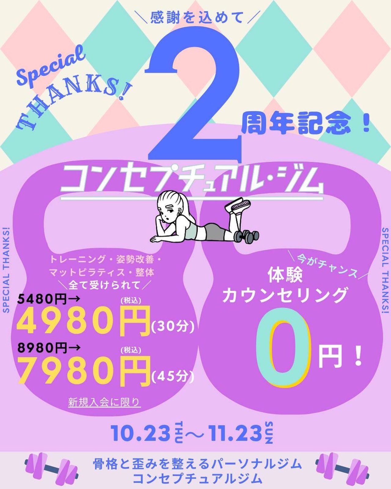 皆様のおかげでコンセプチュアルジムは、2周年を迎えることができました🎉日頃の感謝を込めて、体験カウンセリングが今だけ0円!!...