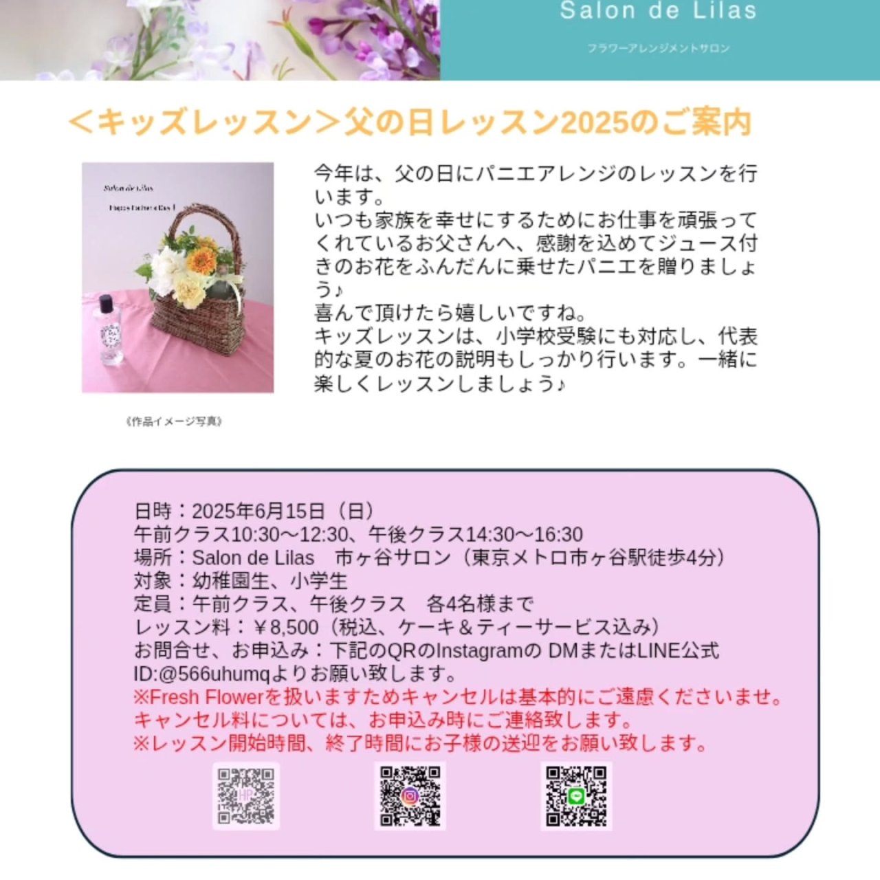 【フレッシュフラワーレッスンのご案内】6/15(日)にキッズ対象の父の日レッスンを行います👨ジュース付きのパニエアレンジを製...