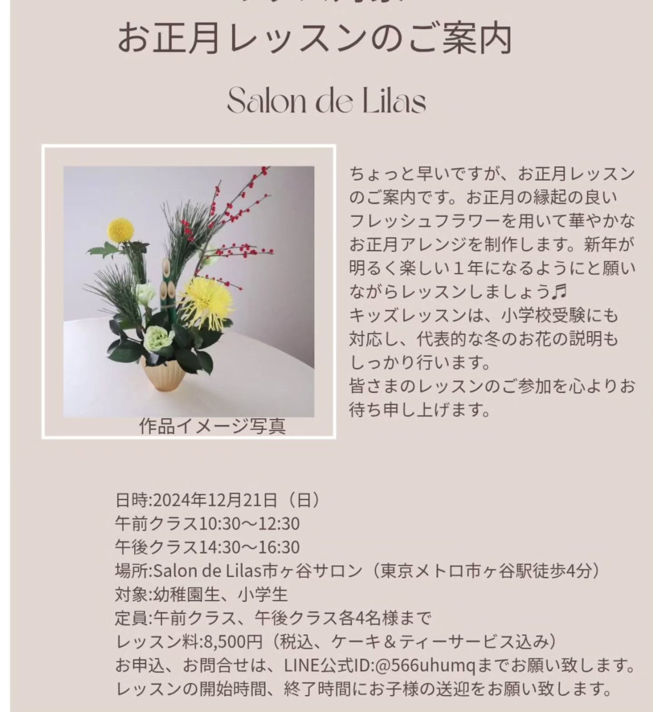 こんにちは☀2025/12/21(日)にキッズ対象のフレッシュフラワーのお正月レッスンを行います🎍縁起のよい花材を用いて、新しい...