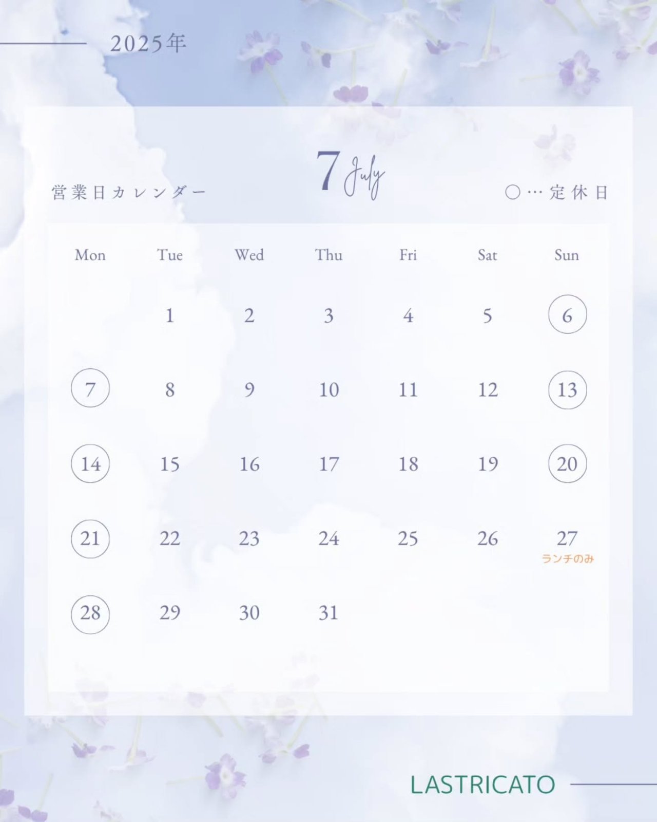 Ciao a tutti☀下半期スタートの7月。今月も、暑さに負けず元気に営業していきたいと思います👊💥定休日は、毎週日曜·月曜27日第4...