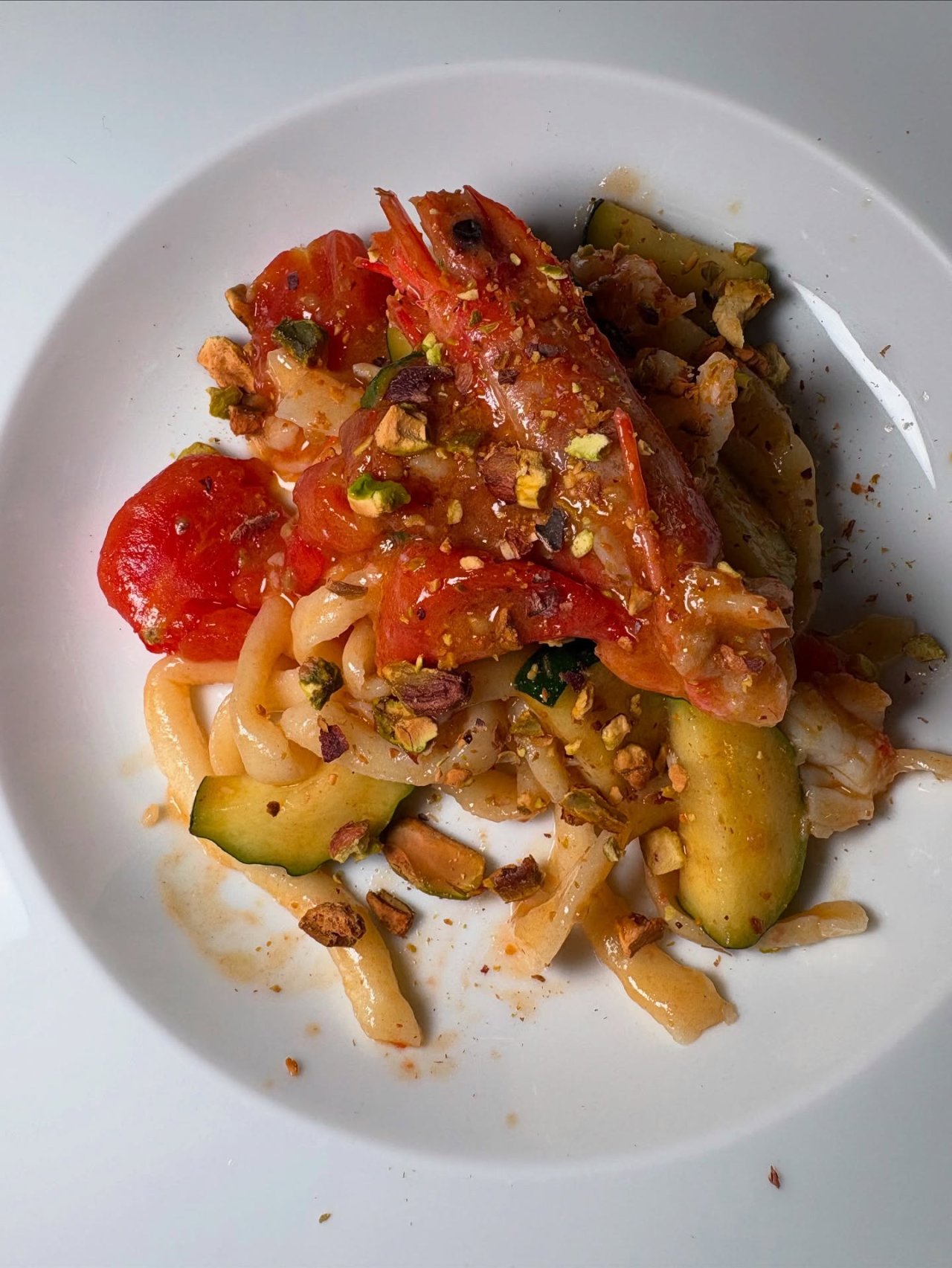 🍝✨本日のおすすめパスタ✨手打ちの トロッコリ に、旨みたっぷりの 赤海老🦐 と旬の ズッキーニ🥒、甘みあふれる ミニトマト🍅 のソース...