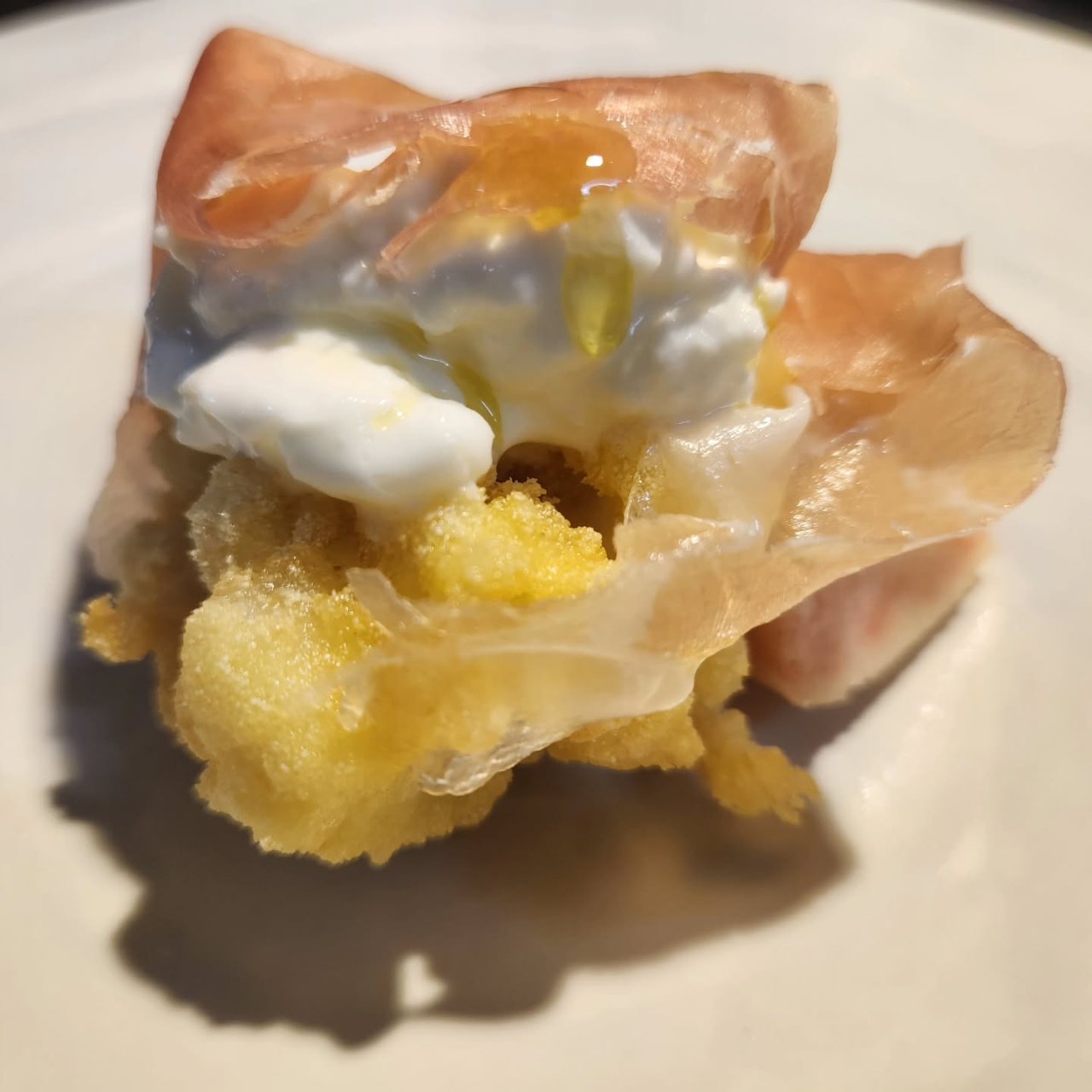 鱧🍑鱧/桃/ストラッチャテッラ/生ハム鱧と桃で韻を踏むと相性良かったりします。#神楽坂イタリアン#神楽坂ラストリカート#飯田...