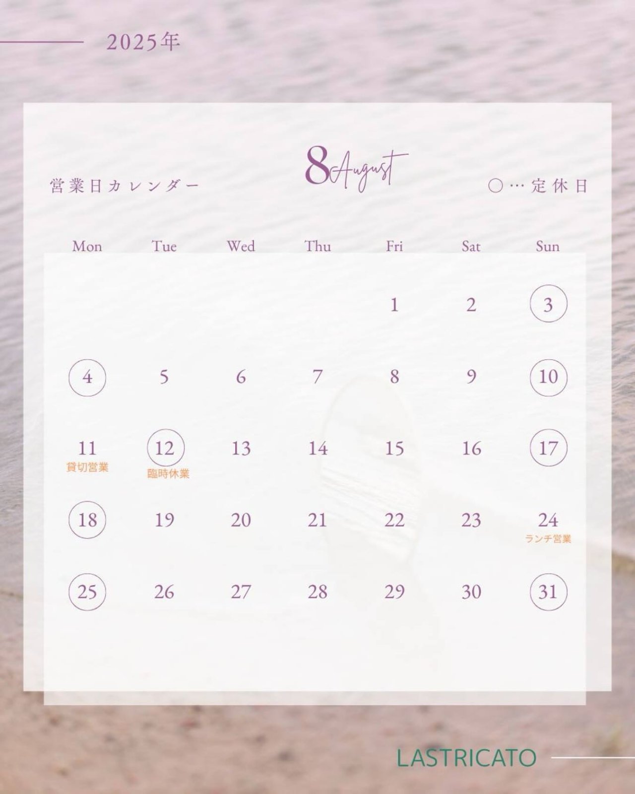 皆様、こんにちは😃いつも有難うございます❗️8月の定休日のお知らせです。尚、8/11(月)は通常定休日ですが、貸切のご予約を頂...