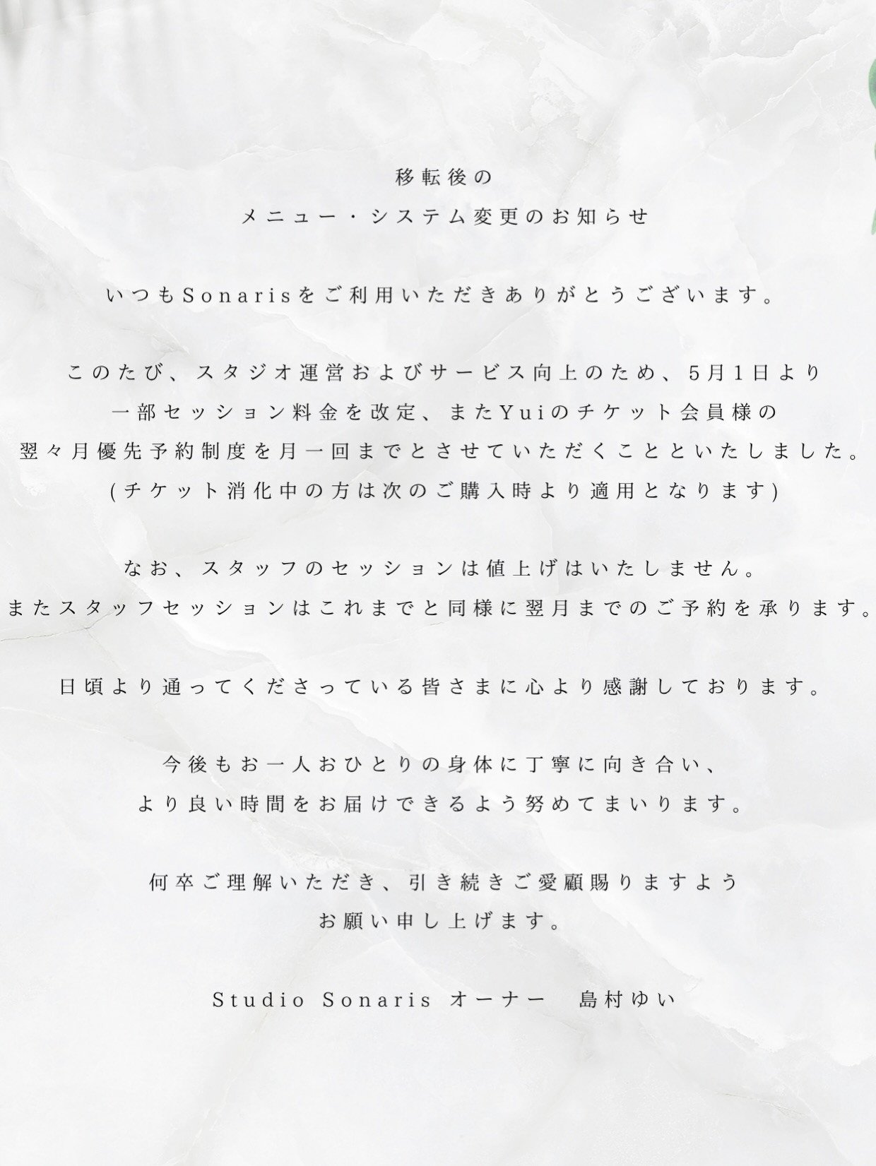 今後について、大切なお知らせ🌸✨いつも当スタジオをご利用いただきありがとうございます🌿このたびSonarisは、より心地よい空間...