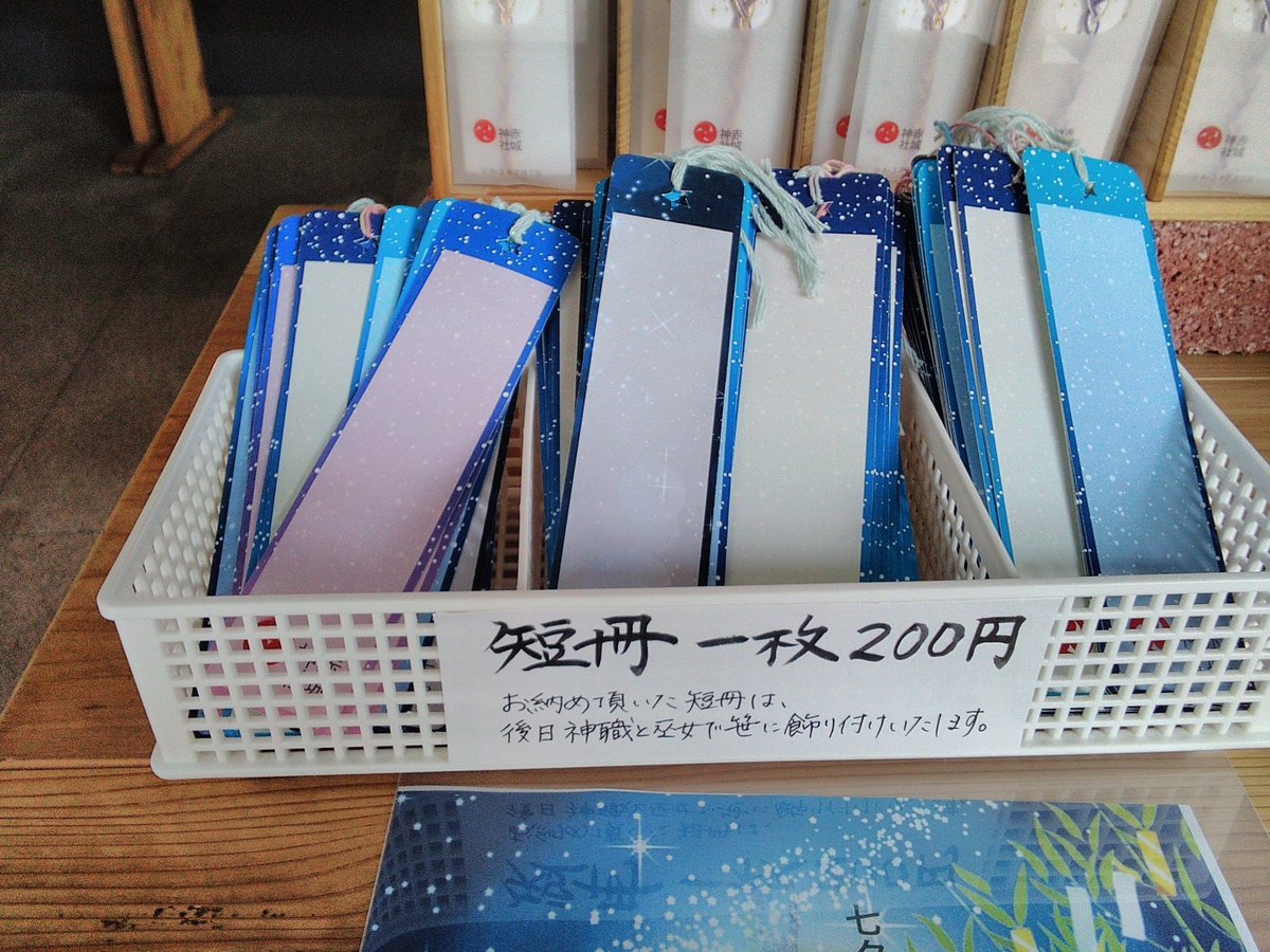 七夕祭に向けて短冊の授与を始めました。短冊のみが200円、短冊付きの縁結びの水引が1000円です。皆様の書いた短冊は7/7までに職員...