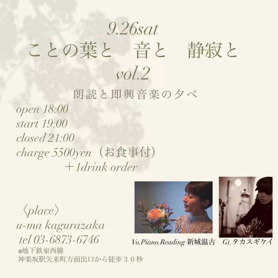 【9月26日のライブ】主催:u-ma kagurazaka「ことの葉と 音と 静寂と」出演:新城温古(Pf,Vo Reading)、タカス...