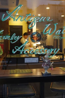 昼間はカフェ、夜はバーとして営業しながら、その店名の由来通りアンティークウォッチの販売もしております。時計の修理や電池交換も承っておりますので、気軽にお立ち寄りください。