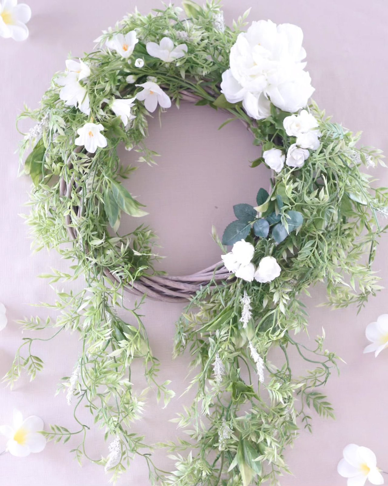 1年中ドアやお部屋の壁に飾れる爽やかなホワイト&グリーンのリースです🌿