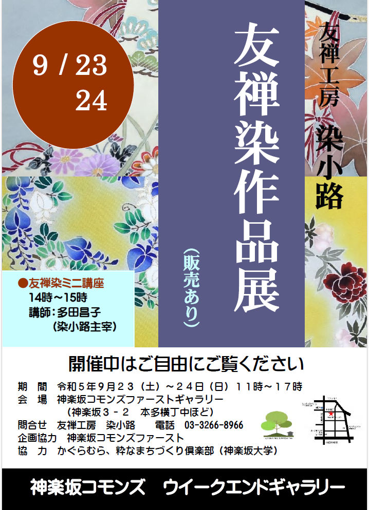 神楽坂六丁目で活動中の、友禅染工房「染小路」の、友禅染作品展と友禅染ミニ講座を9月23日、24日、神楽坂コモンズで開催いたします。