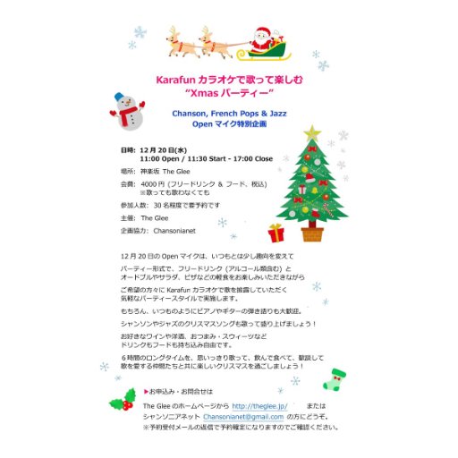 | 関連サイト | http://theglee.jp/schedule/theglee%e3%83%a9%e3%83%b3%e3%83%81%e3%82%bf%e3%82%a4%e3%83%a0%e3%82%a4%e3%83%99%e3%83%b3%e3%83%88xmas%e3%83%91%e3%83%bc%e3%83%86%e3%82%a3%e3%83%bc%e3%80%80chanson-french-pops-jazz-open-mic/ |