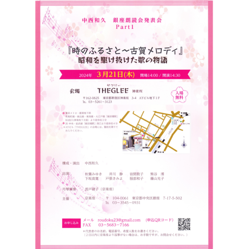 | 場所 | THE GLEE/〒162-0825 東京都新宿区神楽坂3丁目4 AYビル B1F、東京メトロ(東西線・有楽町線・南北線・大江戸線)飯田橋駅B3出口より徒歩3分、JR総武線飯田橋駅西口より徒歩4分 |