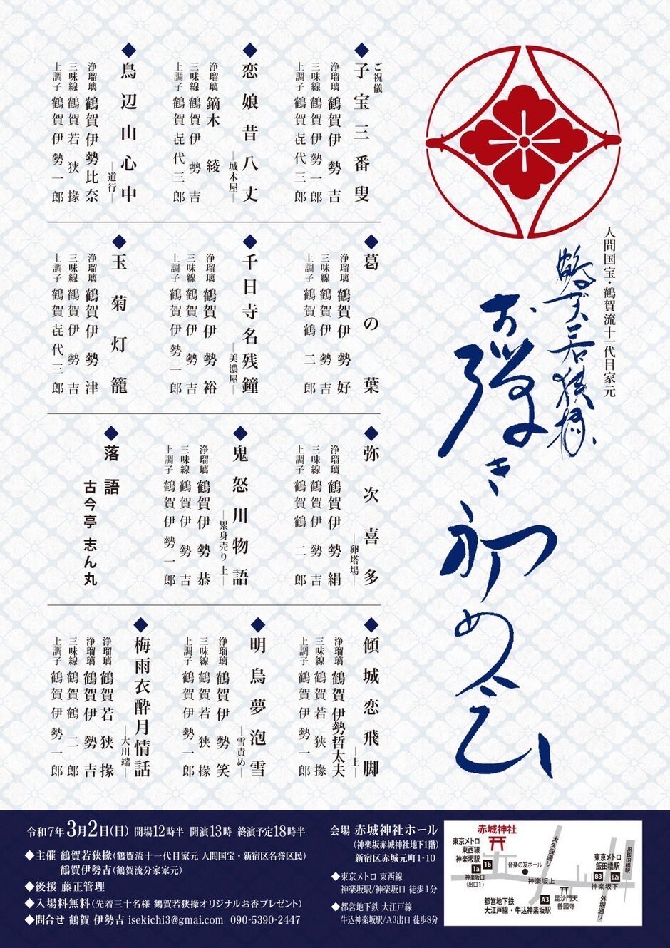 「神楽坂散策がてらご来場くださいませ。私は若狭掾師匠と『梅雨衣酔月情話』をご一緒させていただきます。」