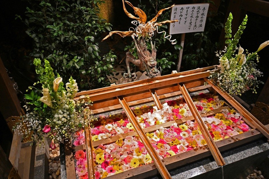 朝の清々しい空気の中でも、夕暮れの柔らかな光のもとでも、それぞれ異なる表情を見せる花手水を、ぜひお楽しみください。