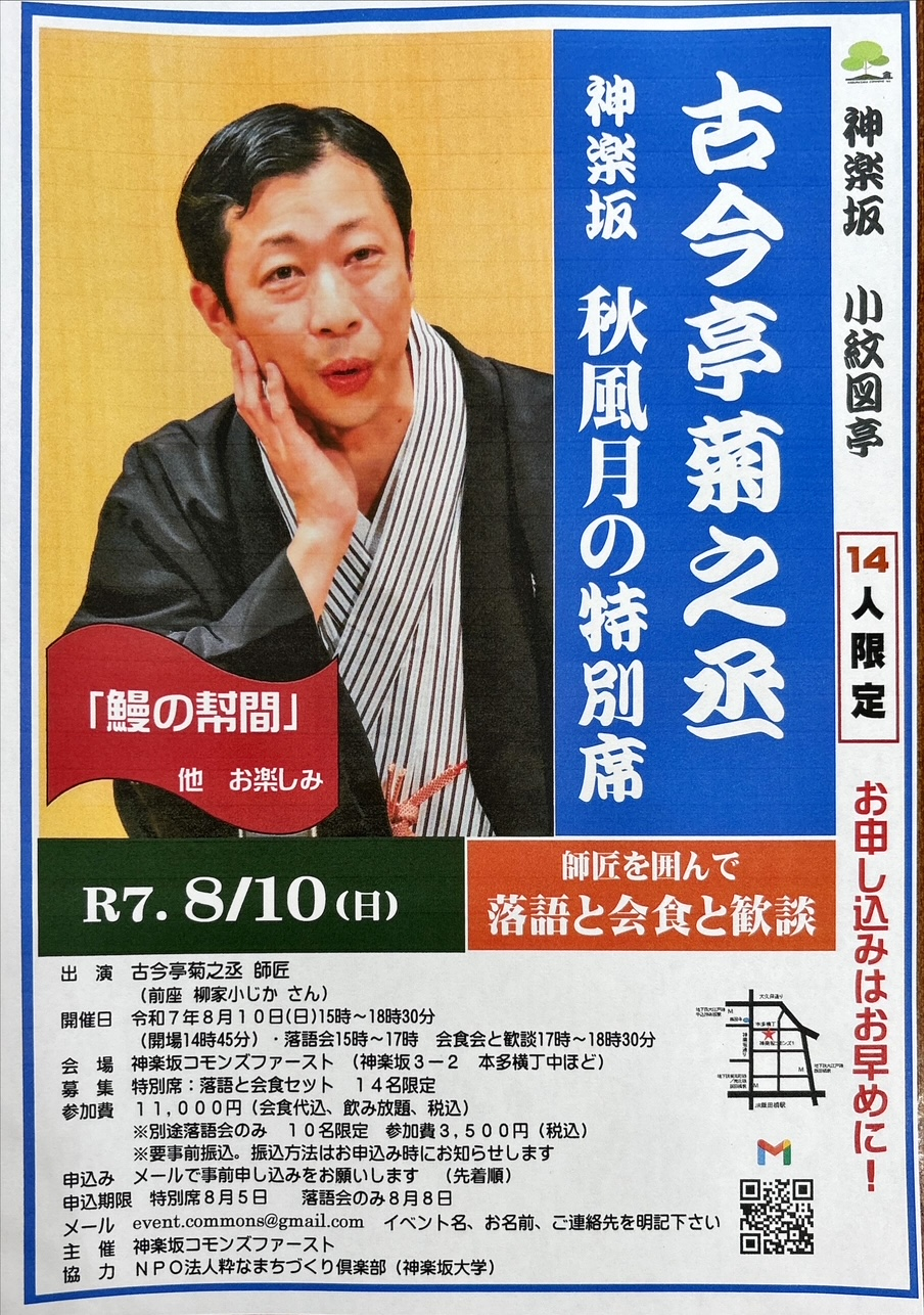 特別席:第一部・第二部セット(落語と師匠を囲んでの会食セット) 定員14名 参加費11,000円(会食代込・飲み放題・消費税込) ※別途第一部のみ(落語会のみ)もご用意しています。 但し定員10名 参加費 3500円(消費税込み) *全て要事前申込み・要事前振込。振込方法・振込口座・振込期限は申し込み時にお知らせします。 *振込後のキャンセルは出来ませんのでご承知おきください。振込手数料はご負担ください。 |