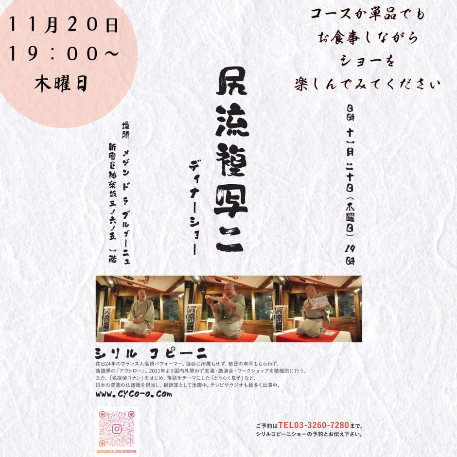 こちらで11月20日に、フランス人落語パフォーマーの尻流複写二(シリル コピー二)によるディナーショーが行われます。
