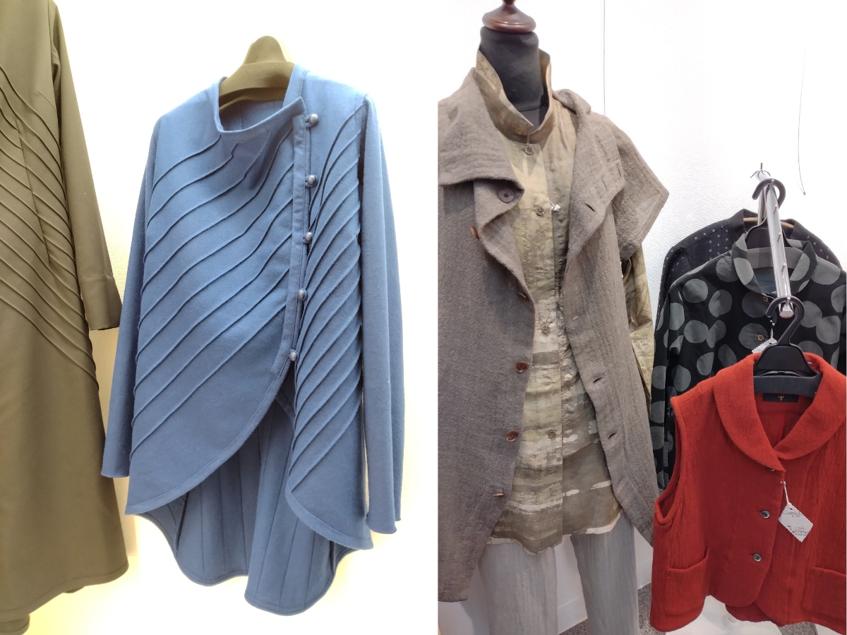 「タックをデザインとして取り入れた青木りつ子さんの服、量産品にこれが無いのは緻密な計算と手間が必要だから、これがハンドメイドの魅力」と語るのは、アートスペースKのオーナー。