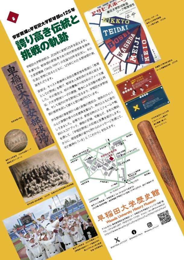 本展では、野球部の創設者であり初代野球部長を務めた安部磯雄(1865–1949)の生誕160年を記念し、その生涯と思想に迫るとともに、125年にわたる野球部の軌跡をたどります。