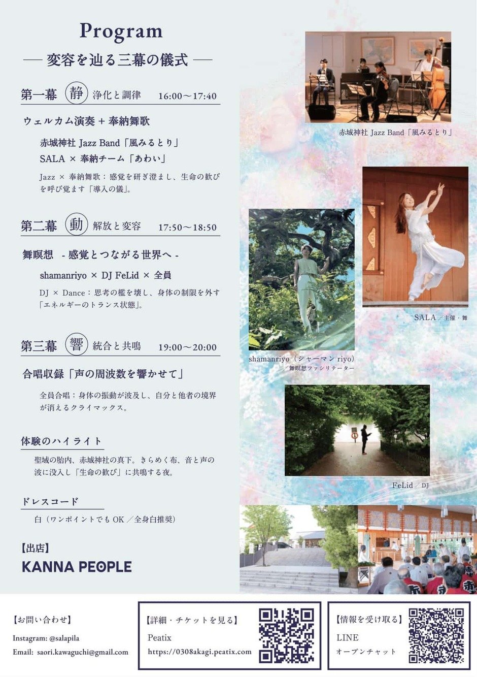日々の思慮や言葉をいったん手放し、舞い、歌い、音に身を委ねる中で、心身を清め、生命のめぐりに静かに立ち返る。そのような時間を、お過ごしください。