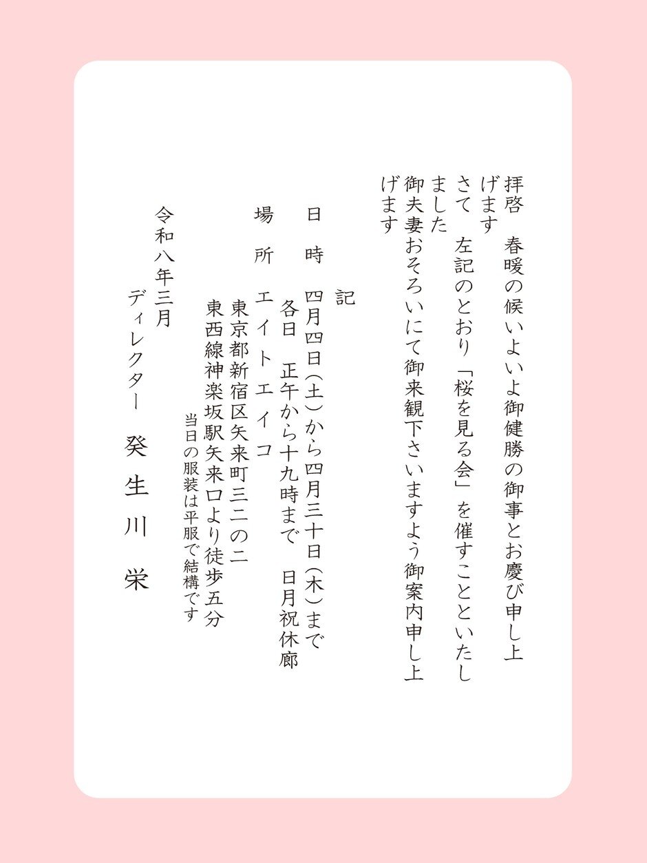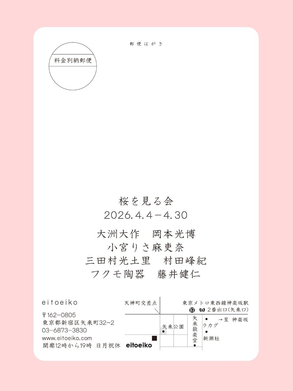 本展は「文化の観桜会」を目指し、桜という落葉樹の特徴や象徴するもの、風習や言葉を引用した作品が多数発表されています。今年度は様々な分野で活躍する七名の作家による「桜」あるいは「桜を見る会」が想起される作品を展示いたします。皆様のご高覧をお待ちしております。