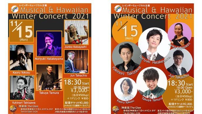 瀧澤 行則(Vo)、横洲 かおる(Vo)、小林 潤子(フラダンサー)、高知 尾純(Pf)、ゲスト : 畠山 典之(劇団四季出身ミュージカル俳優)、ゲスト : 田村 拓也(マリンバ奏者、ドラマー、パーカッショニスト)