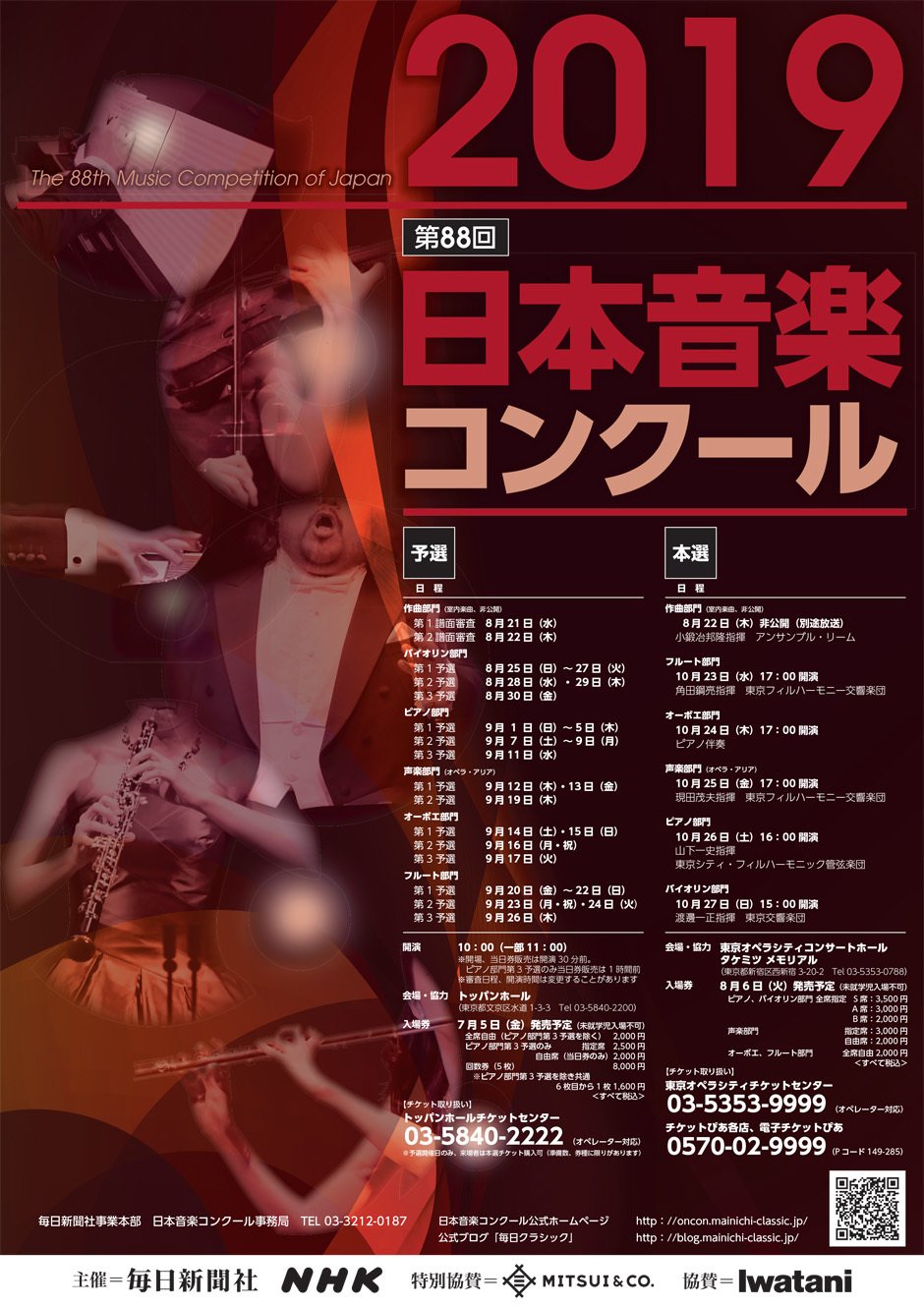 | お問い合わせ | お問い合わせ: 日本音楽コンクール事務局 03-3212-0187 予選開催日事務局 03-3817-0152 チケットのお申込み: トッパンホールチケットセンター 03-5840-2222 |