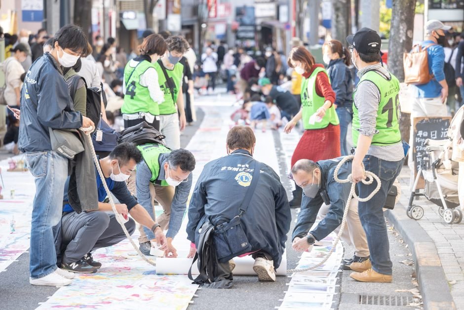 神楽坂の路上に広げた紙に、誰でも自由にお絵かきできます!