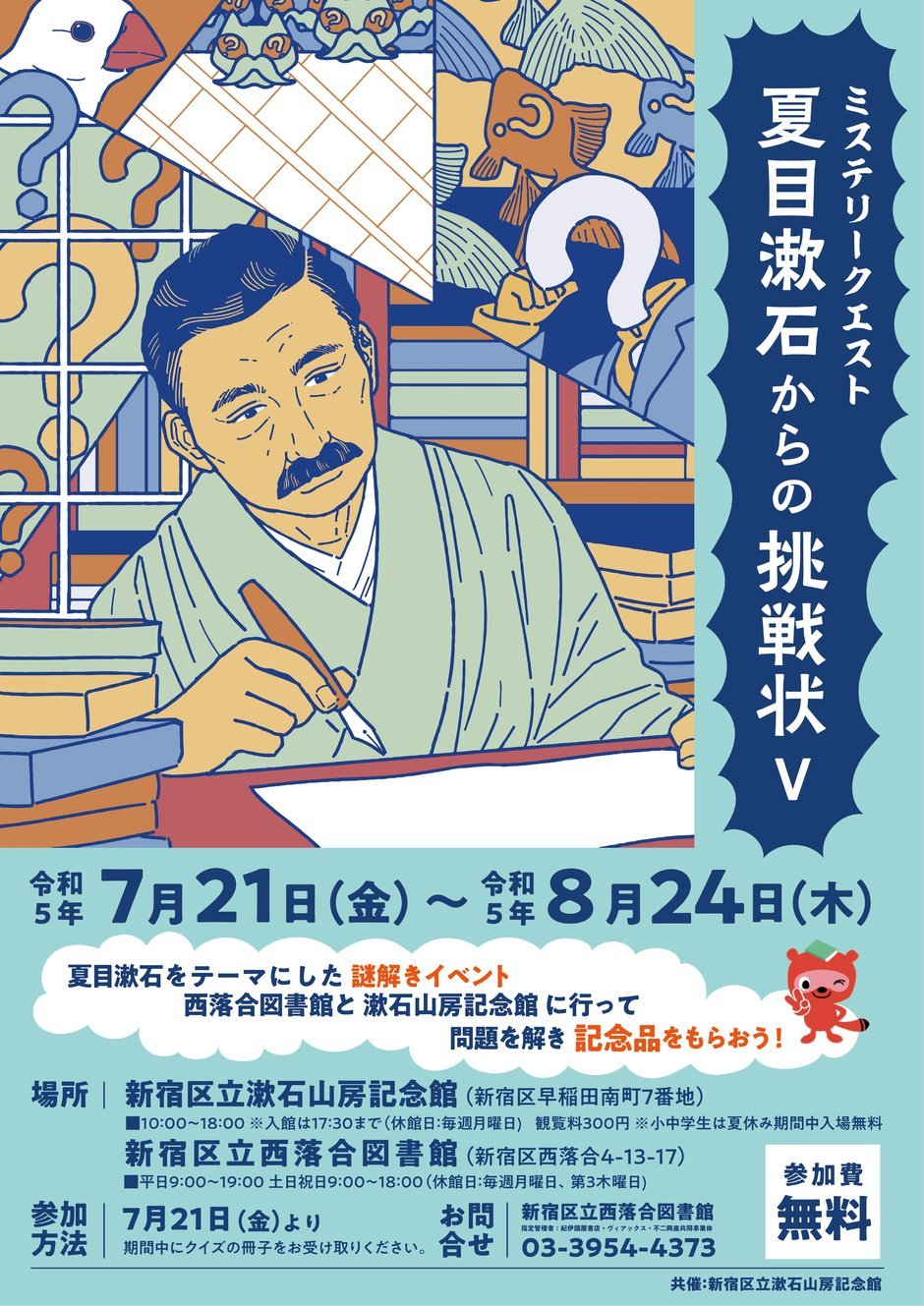夏目漱石をテーマとした謎解きイベント、ミステリークエスト~夏目漱石からの挑戦状 Ⅴ~を、今年も開催します。