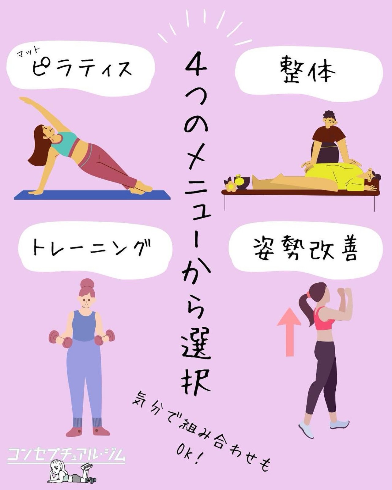 ✨4つのメニューから自由に選べる✨コンセプチュアルジムでは、✔︎ マットピラティス✔︎ 整体✔︎ トレーニング✔︎ 姿勢改善をその日...