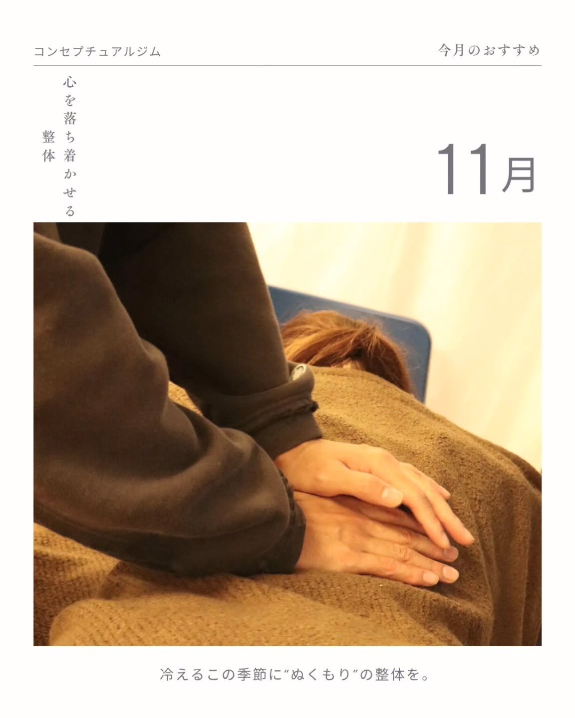 #整体 #リラクゼーション #11月のおすすめ #心と体のケア #ぬくもり整体 #温活 #コンセプチュアルジム