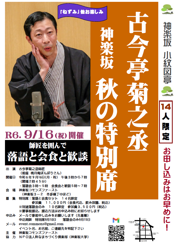 人数限定、「古今亭菊之丞 神楽坂 秋の特別席」(落語と会食と歓談)