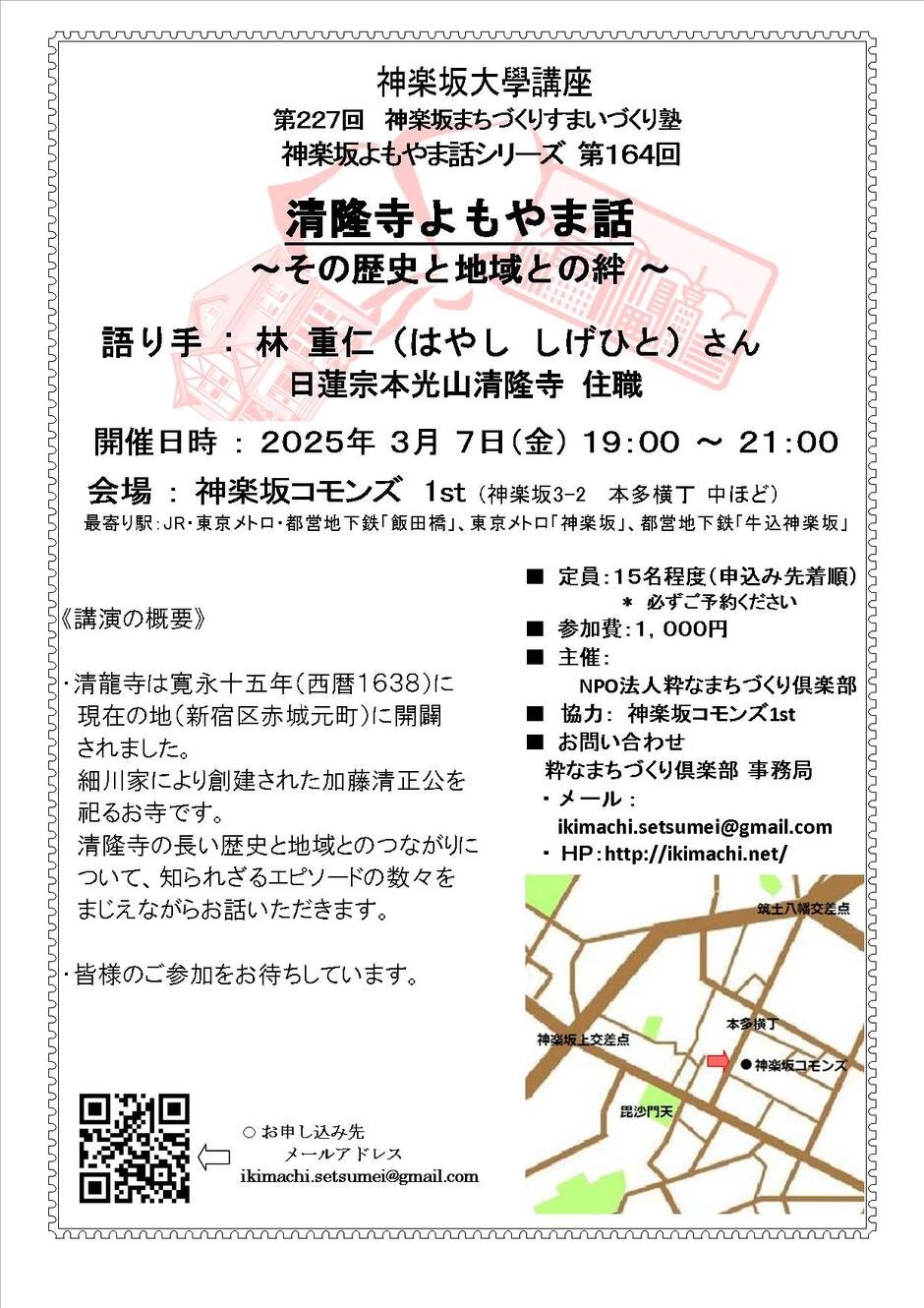 ・清龍寺は寛永十五年(西暦1638)に現在の地(新宿区赤城元町)に開闢されました。細川家により創建された加藤清正公を祀るお寺です。清隆寺の長い歴史と地域とのつながりについて、知られざるエピソードの数々をまじえながらお話いただきます。