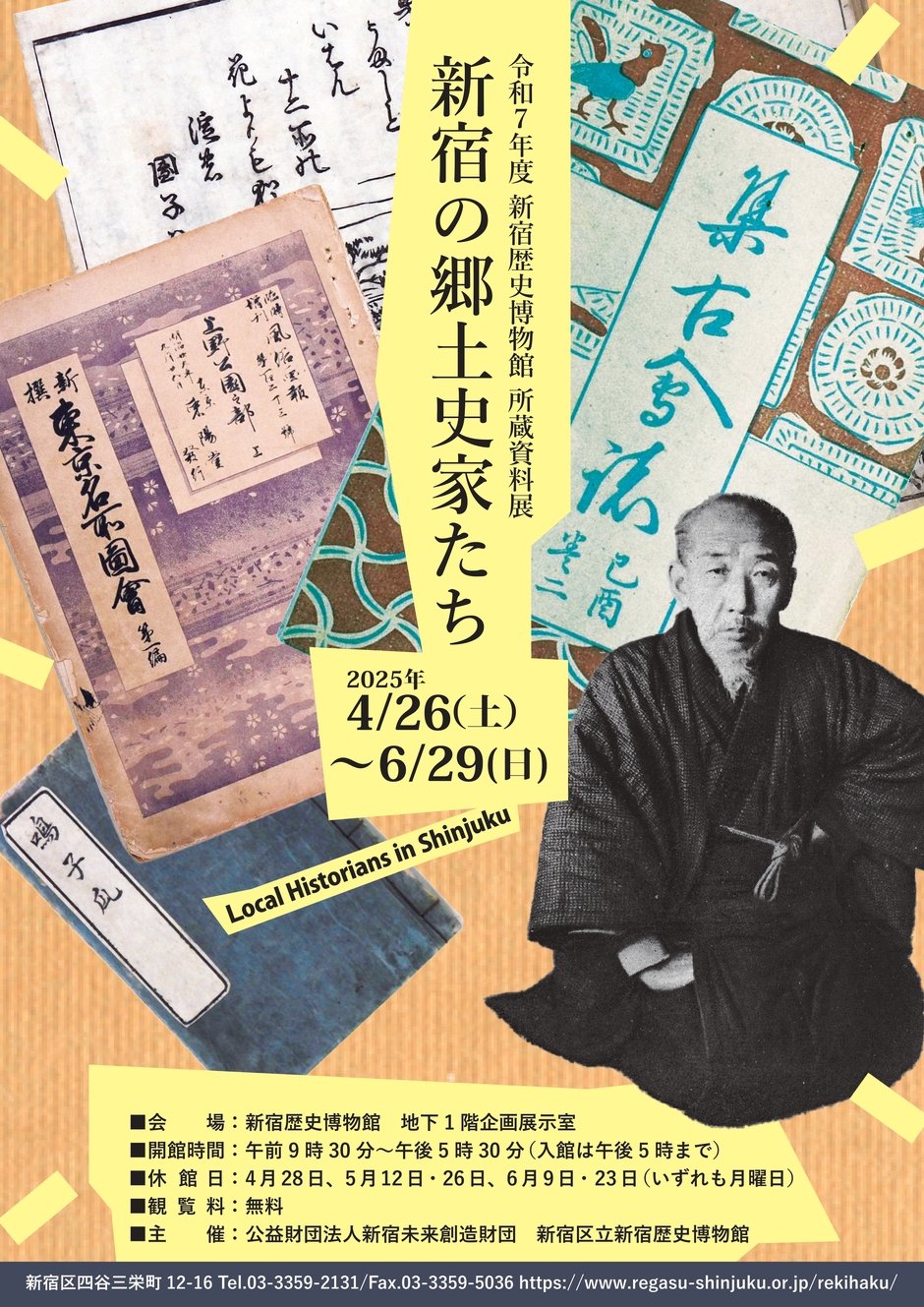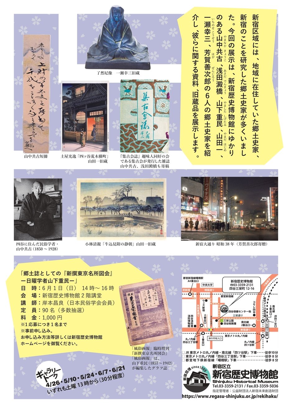 新宿歴史博物館にゆかりのある山中共古(やまなかきょうこ)、浅田澱橋(あさだでんきょう)、山下重民(やましたしげたみ)、山田一(やまだはじめ)、一瀬幸三(いちのせこうぞう)、芳賀善次郎(はがぜんじろう)の6人の郷土史家を紹介し、彼らに関する資料、旧蔵品を展示します。【開催期間】