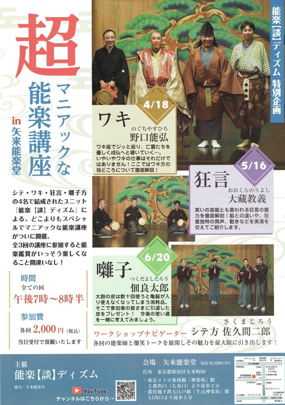 シテ・ワキ・狂言・囃子方の4名で結成されたユニット「能楽【談】ディズム」による、どこよりもスペシャルでマニアックな能楽講座がついに開催。