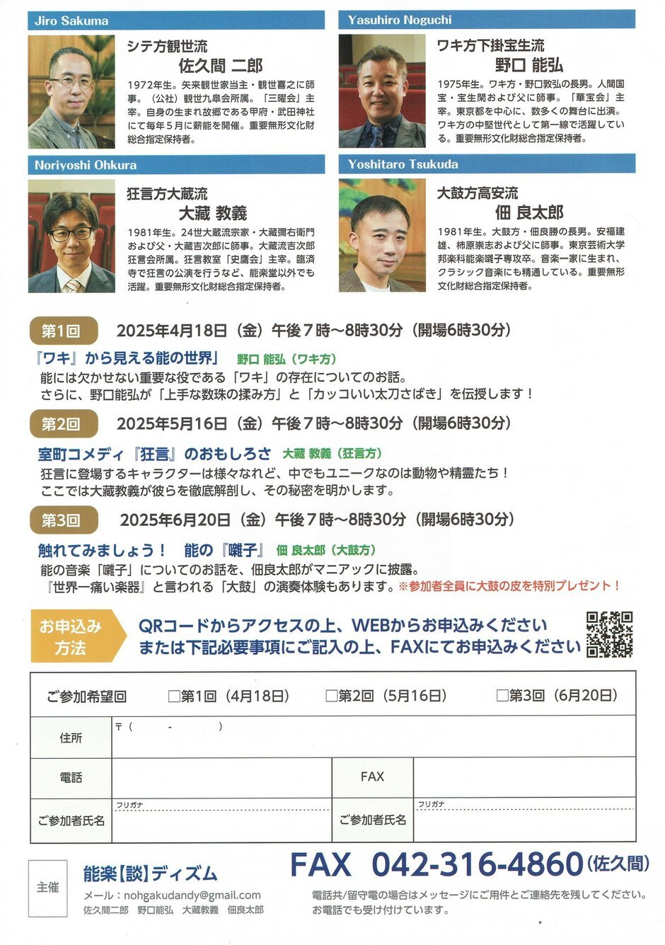 | お問い合わせ | 主催:能楽【談】ディズム メール:nohgakudandy@gmail.com 佐久間二郎、野口能弘、大藏教義、佃良太郎 FAX:042-316-4860(佐久間) |