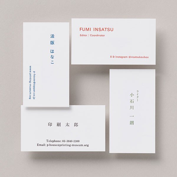 和文と欧文の活字を拾って組み、一般的なサイズよりも小さな名刺をつくります。組み方向を縦横から選び、好きな色のインキで印刷します。 ※片面印刷のみ。