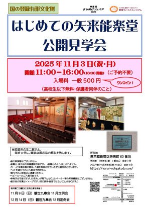 国の登録有形文化財「矢来能楽堂」の公開見学会です。装束や能面のミニ展示、毎時0分に能楽についての解説も。詳細