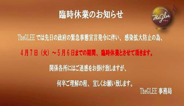先日の政府の緊急事態発令に伴い、感染拡大防止のため、4月7日(火)~5月6日までの期間、無観客公演等も含めすべての公演を中止し、臨時休業とさせて頂きます。