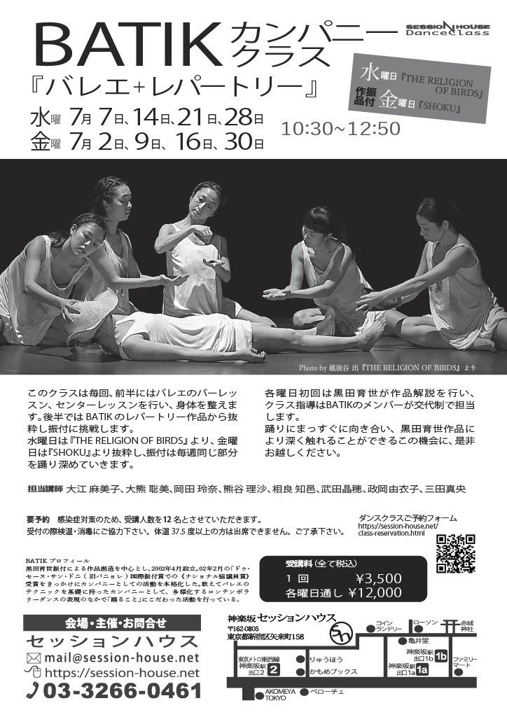 水曜日は『THE RELIGION OF BIRDS』より、金曜日は『SHOKU』より抜粋し、振付は毎週同じ部分を踊り深めていきます。各曜日初回には黒田育世が作品解説を行い、クラス指導はBATIKのメンバーが交代制で担当します。