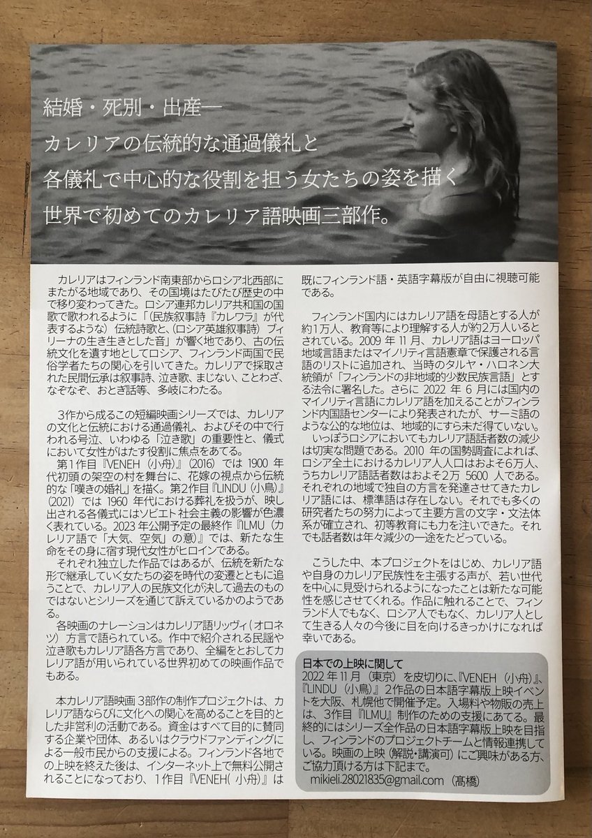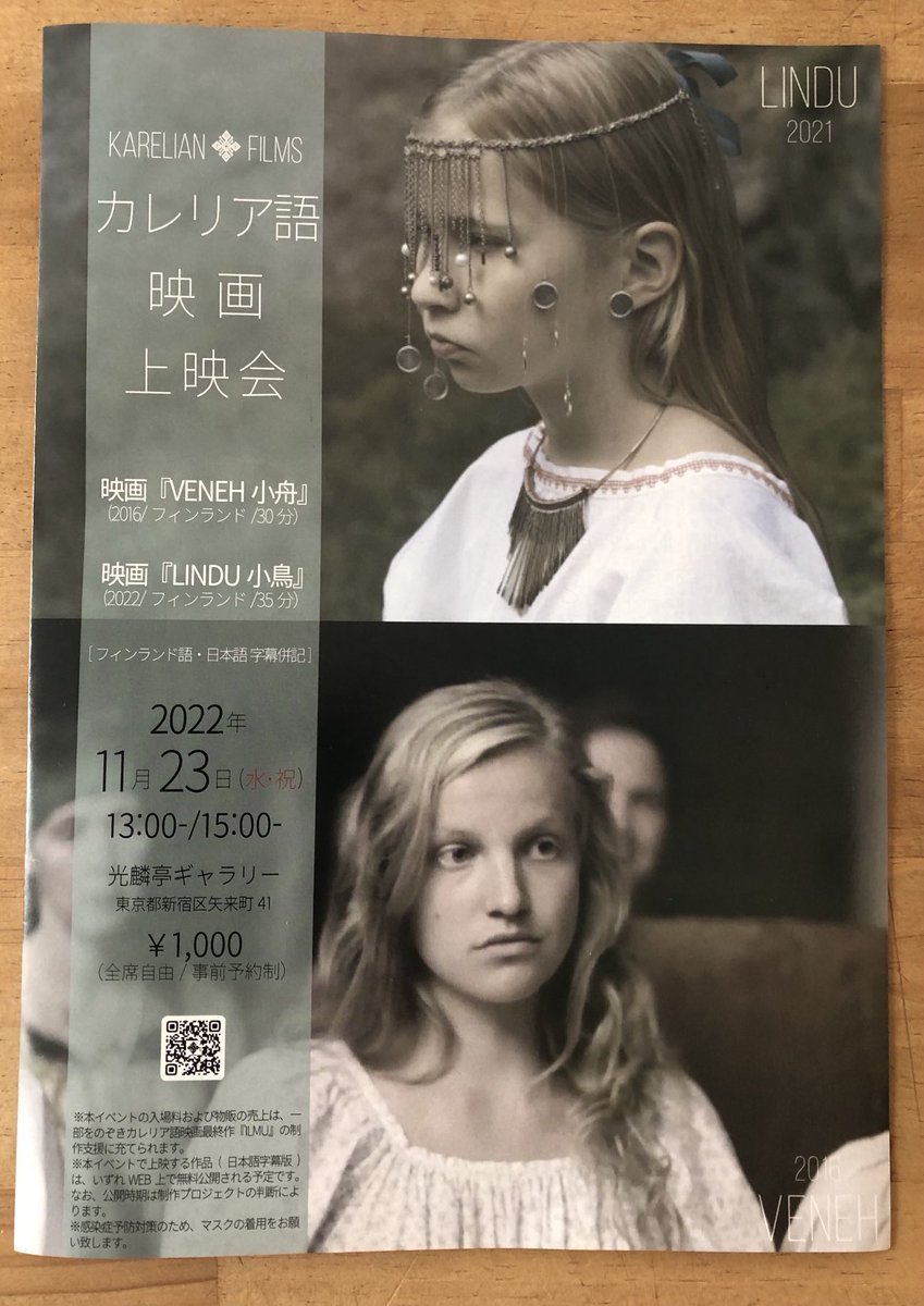 「カレリア語」映画上映会のパンフを20部程いただきました。上映は11月23日神楽坂駅近くのギャラリーです。カレリア語の存在を知りま...