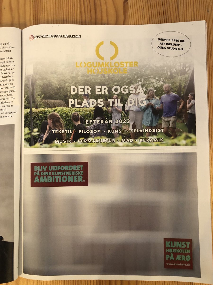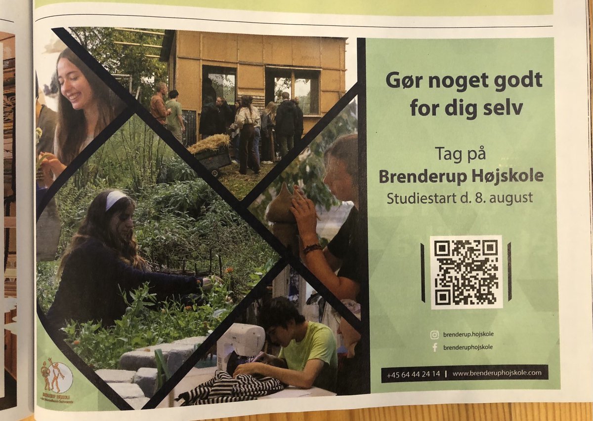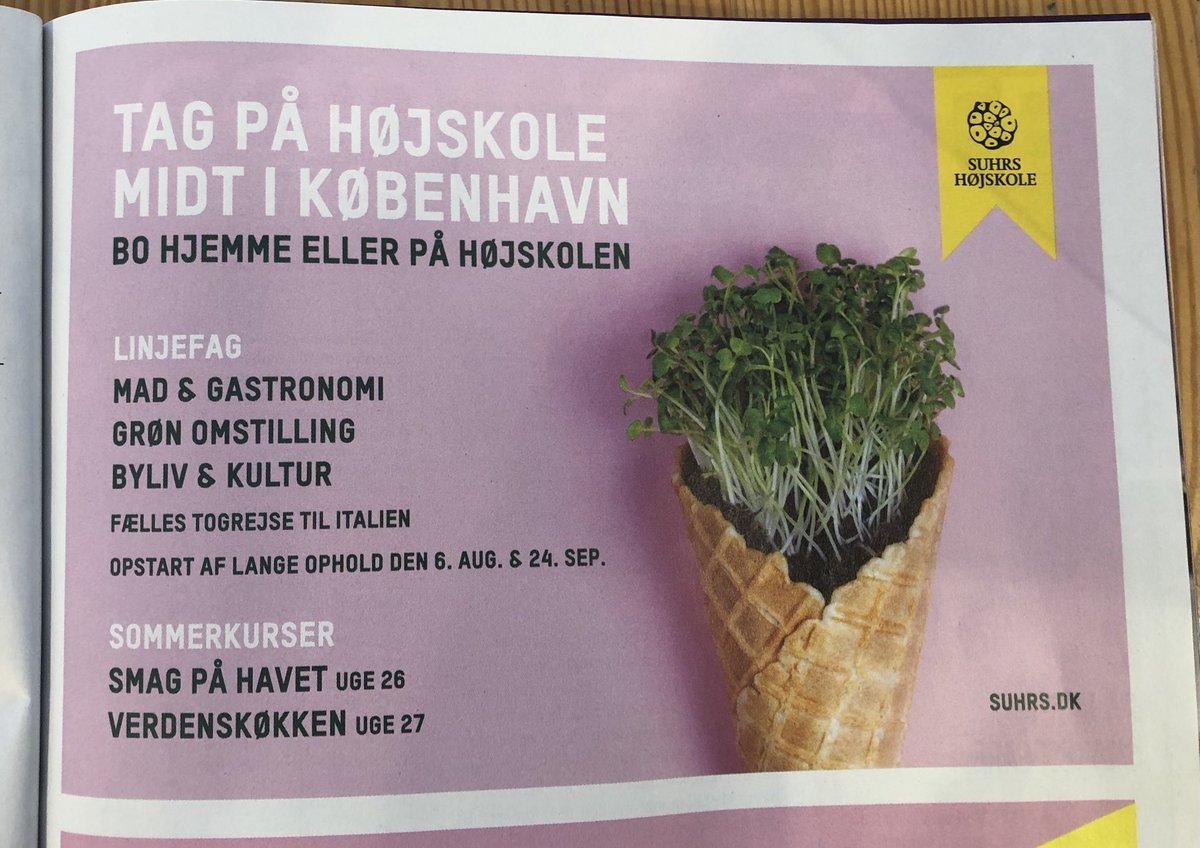 デンマーク鉄道車内誌「Ud&Se」4月号。いくつかのフォルケホイスコーレの広告。コペンハーゲンにある食の学校Sjurshøjskoleの写真にユーモアがあっていいと思う。