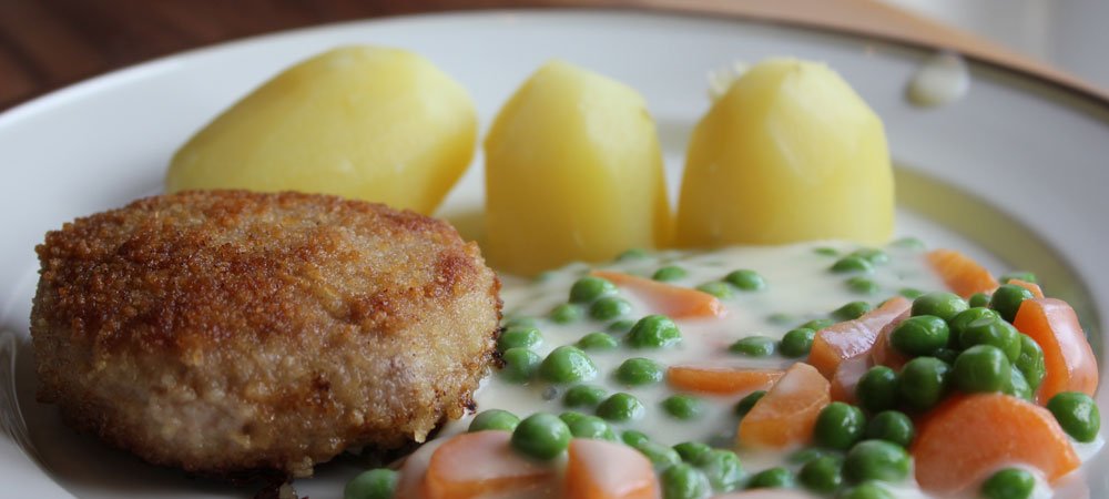 典型的なデンマークの定番ランチ(Dagens ret)の一つ。今時な75Kr(1500円くらい)。ジャガイモがメチャクチャ美味しい。