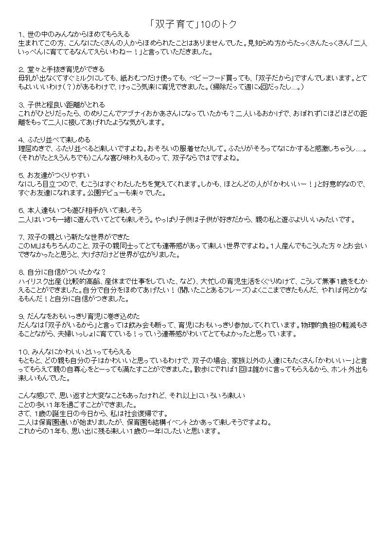 03年迄約10年間多胎児の育児雑誌を刊行しました。分け合って原稿整理したら当時神奈川県在住のツインマザーがネットに「双子育て10のトク」を公開しました。非常に感動し転載許可をお願いしたらどうぞどうぞでした。すべての多胎ママがこのようにはいかないですが参考にして下さい。