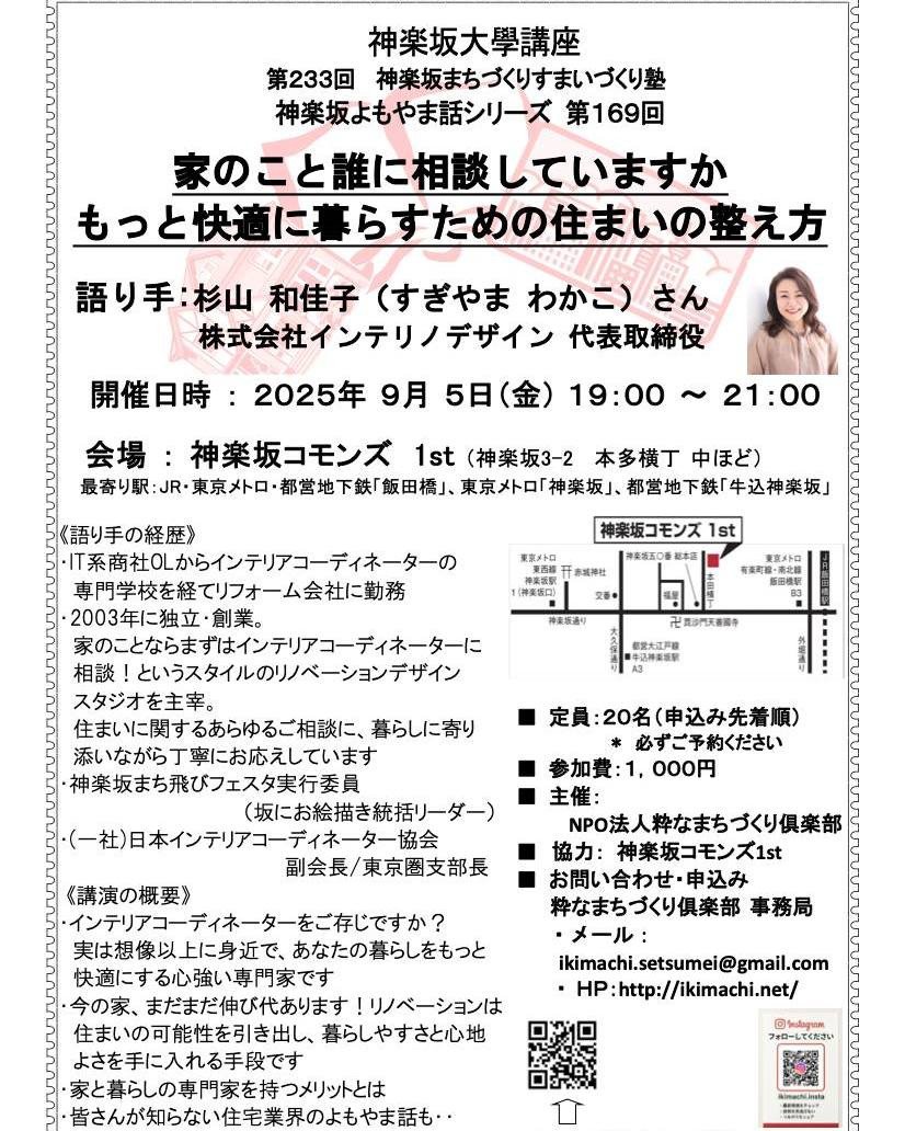 2025年9月5日(金) に開催される、第233回 神楽坂まちづくりすまいづくり塾にて、代表の杉山和佳子が語り部として登壇します。
