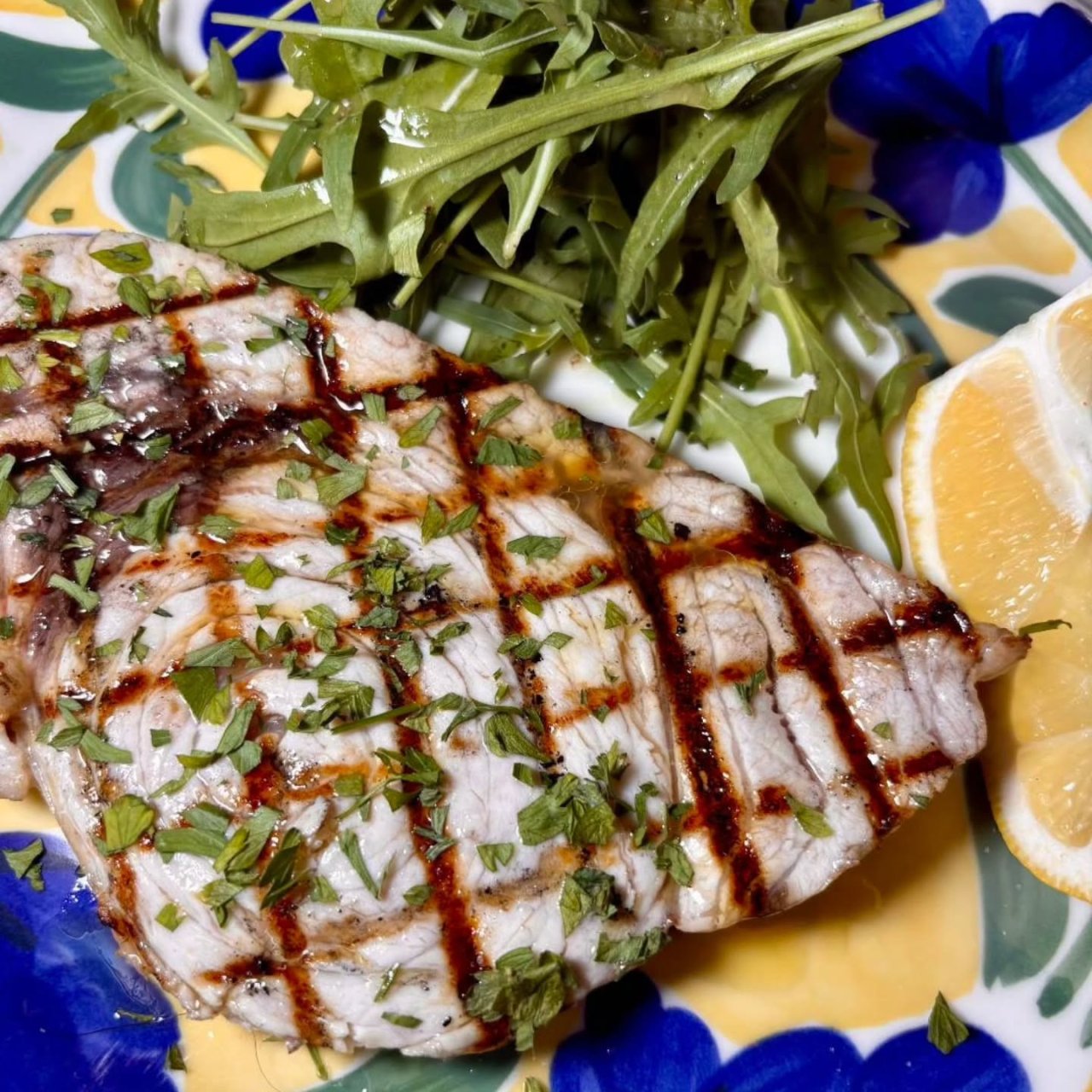 オーダーを頂いてから、5キロアップのブロックから切り出し、シンプルに炭火でグリル。オリーブオイルとレモンをたっぷりかけたメカジキは最高に美味でございます!!