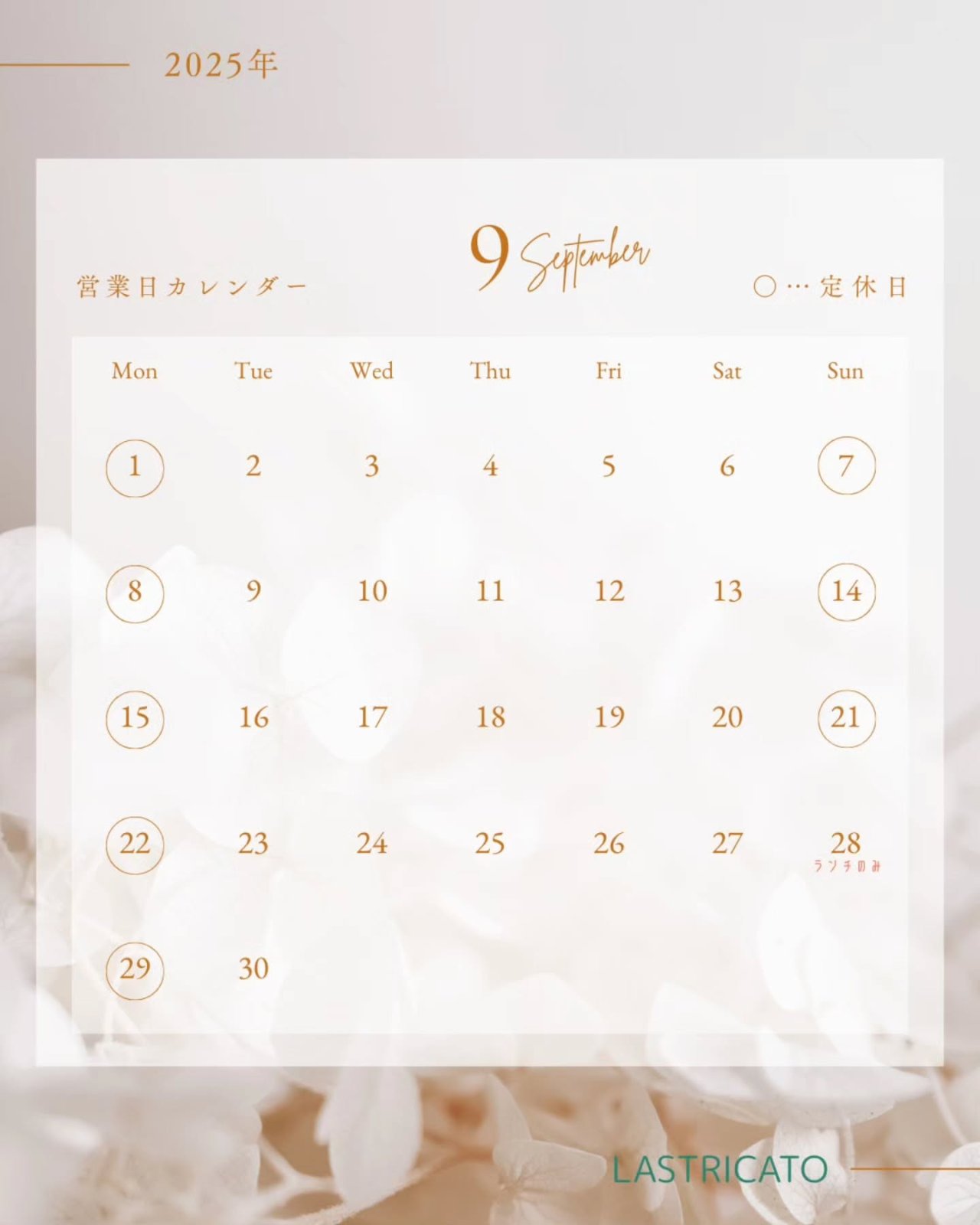 Ciao a tutti☀9月定休日のお知らせです!定休日は毎週日曜、月曜28日の第4日曜は、ランチのみ営業致します。季節のおすすめメ...