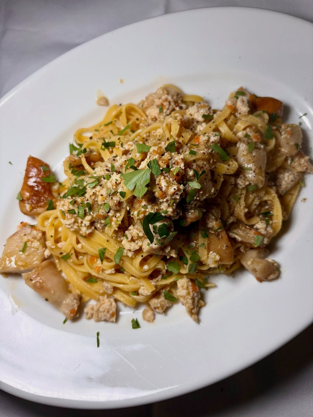 幅のある形状がラグーソースをしっかりと受け止め、一口ごとに鶏の旨みとポルチーニの香りが広がります。