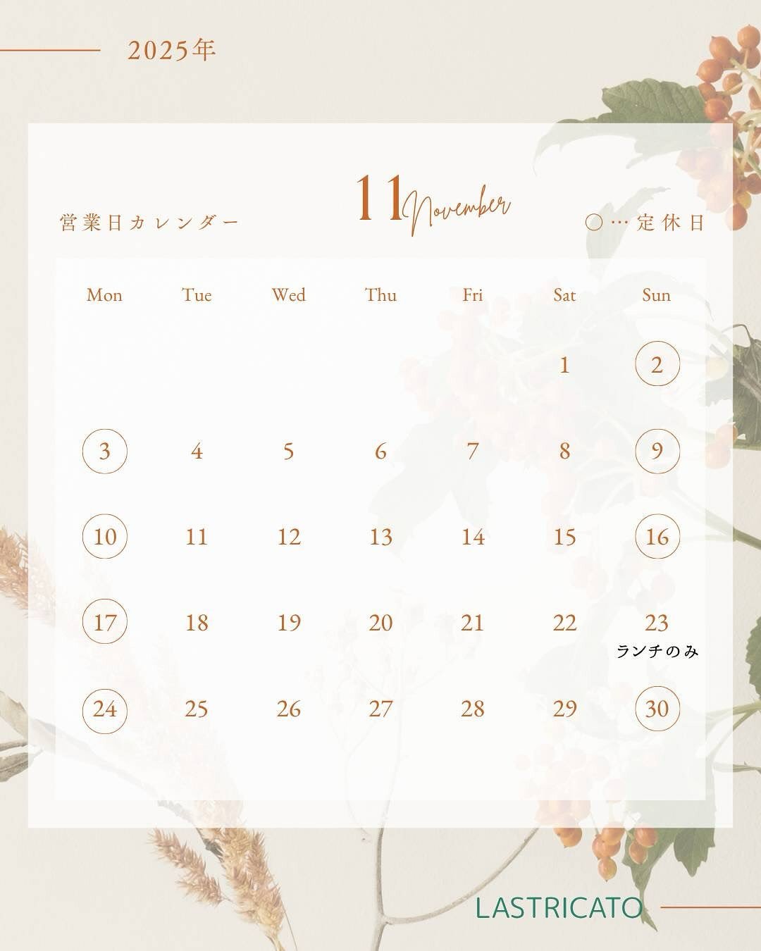 Buon giorno☀今日から11月と今年も残すところ後2ヶ月となりました。定休日のお知らせです↓↓↓定休日は、日曜·月曜第4日曜ランチ...